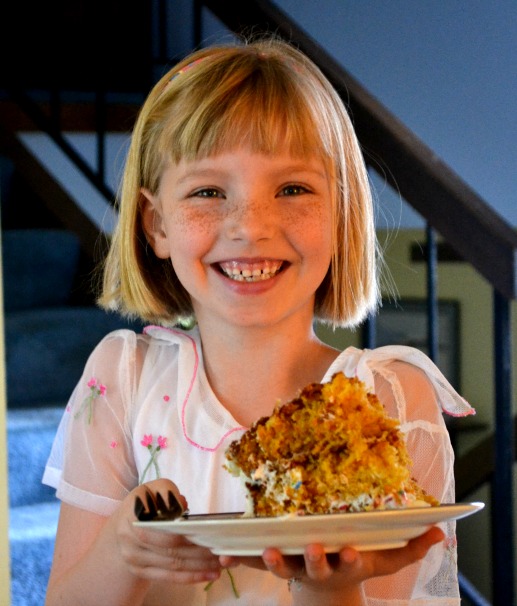 When ready to serve, be sure to cut big, fat slices and hand them to a cute little girl to pass around. No one fusses about calories when faced with this grin.